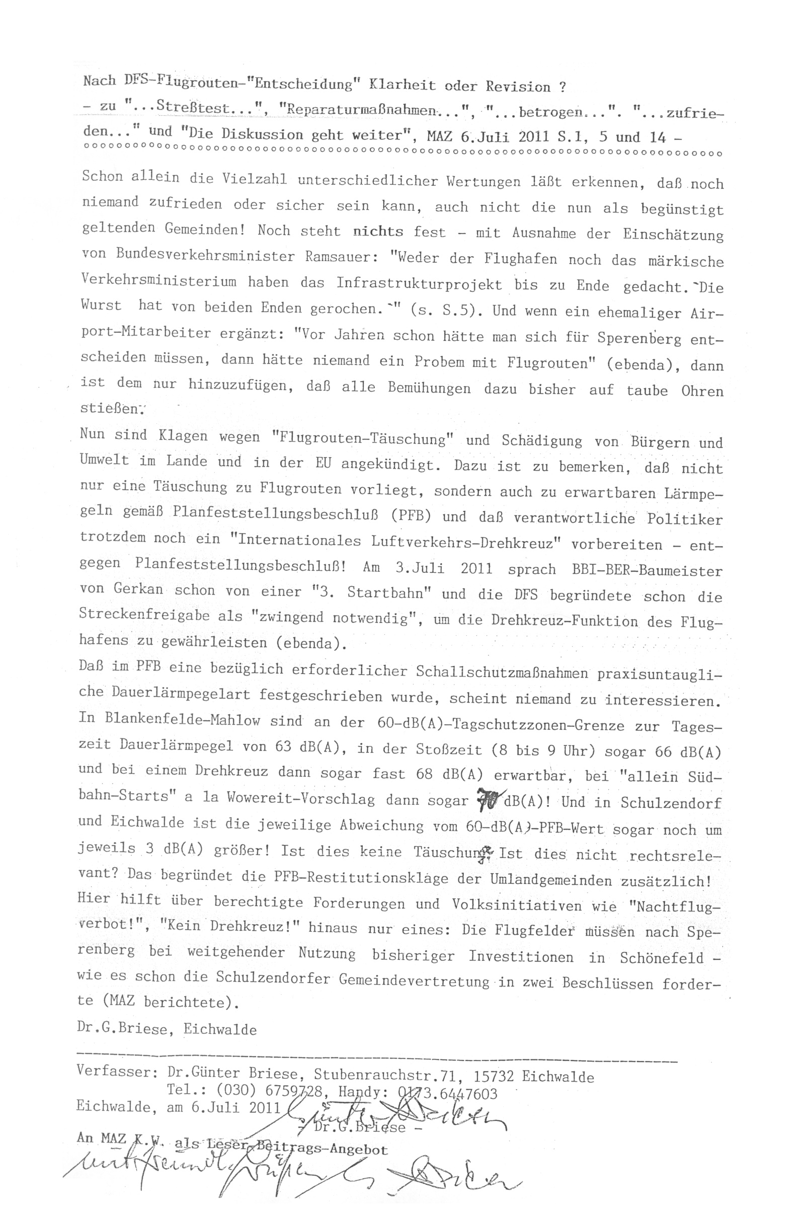 Nach DFS-Flugrouten-"Entscheidung" Klarheit oder Revision ? - zu "... Streßtest... " , ".... Reparaturmaßnahmen ..." , "... betrogen ...", "... zufrieden ..." und " Die Diskussion geht weiter", MAZ 6.Juli 2011 S.1, 5 und 14 - Schon allein die Vielzahl unterschiedlicher Wertungen läßt erkennen, daß noch niemand zufrieden oder sicher sein kann, auch nicht die nun als begünstigt geltenden Gemeinden! Noch steht nichts fest - mit Ausnahme der Einschätzung von Bundesverkehrsminister Ramsauer: "Weder der Flughafen noch das märkische Verkehrsministerium haben das Infrastrukturprojekt bis zu Ende gedacht. Die Wurst hat von beiden Enden gerochen." (s. S.5). Und wenn ein ehemaliger Airport-Mitarbeiter ergänzt: "Vor Jahren schon hätte man sich für Sperenberg entscheiden müssen, dann hätte niemand ein Problem mit Flugrouten" (ebenda), dann ist dem nur hinzuzufügen, daß alle Bemühungen dazu bisher auf taube Ohren stießen:' Nun sind Klagen wegen "Flugrouten-Täuschung" und Schädigung von. Bürgern und Umwelt im Lande und in der EU angekündigt. Dazu ist zu bemerken, daß nicht nur eine Täuschung zu Flugrouten vorliegt, sondern auch zu erwartbaren Lärmpegeln gemäß Planfeststellungsbeschluß (PFB) und daß verantwortliche Politiker trotzdem noch ein "Internationales Luftverkehrs-Drehkreuz" vorbereiten - entgegen Planfeststellungsbeschluß! Am 3.Juli 2011 sprach BBI-BER-Baumeister von Gerkan schon von einer "3. Startbahn" und die DFS begründete schon die Streckenfreigabe als "zwingend notwendig'', um die Drehkreuz-Funktion des Flughafens zu gewährleisten (ebenda). Daß im PFB eine bezüglich erforderlicher Schallschutzmaßnahmen praxisuntaugliche Dauerlärmpegelart festgeschrieben wurde, scheint niemand zu interessieren. In Blankenfelde-Mahlow sind an der 60-dB(A)-Tagschutzzonen-Grenze zur Tageszeit Dauerlärmpegel von 63 dB(A), in der Stoßzeit (8 bis 9 Uhr) sogar 66 dB(A) und bei einem Drehkreuz dann sogar fast 68 dB(A) erwartbar, bei "allein Südbahn-Starts" a la Wowereit-Vorschlag dann sogar 70 dB(A)! Und in Schulzendorf und Eichwalde ist die jeweilige Abweichung vom 60-dB(A)-PFB-Wert sogar noch um jeweils 3 dB(A) größer! Ist dies keine Täuschung Ist dies nicht rechtsrelevant? Das begründet die PFB-Restitutionsklage der Umlandgemeinden zusätzlich! Hier hilft über berechtigte Forderungen und Volksinitiativen- wie "Nachtflugverbot!", "Kein Drehkreuz!" hinaus nur eines: Die Flugfelder müssen nach Sperenberg bei weitgehender Nutzung bisheriger Investitionen in Schönefeld -wie es schon die Schulzendorfer Gemeindevertretung in zwei Beschlüssen forderte (MAZ berichtete). Dr.G.Briese, Eichwalde Verfasser Dr.Günter Briese, Stubenrauchstr.71, 15732 Eichwalde Eichwalde, am 6.Juli 2011 Wurde auch an die MAZ gesendet als Leser-Beitrags-Angebot